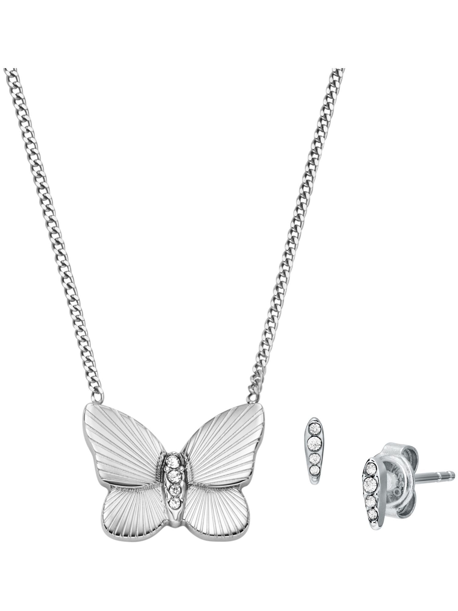 Dieses Set von Fossil besteht aus einer Edelstahlhalskette und Ohrsteckern die ebenfalls aus Edelstahl gefertigt sind.