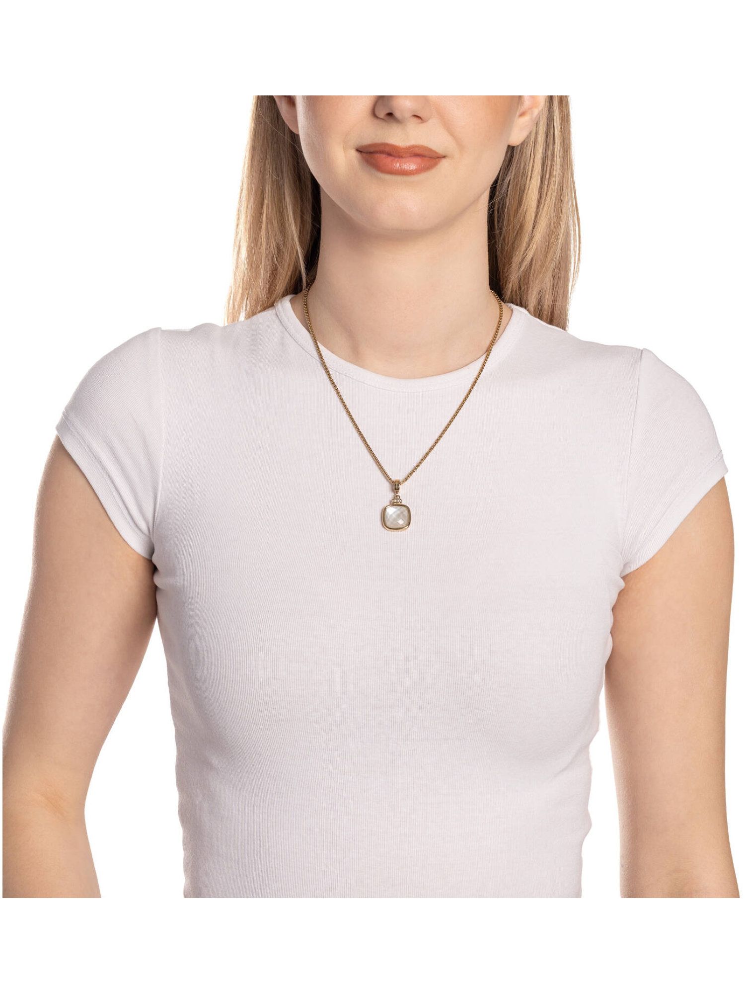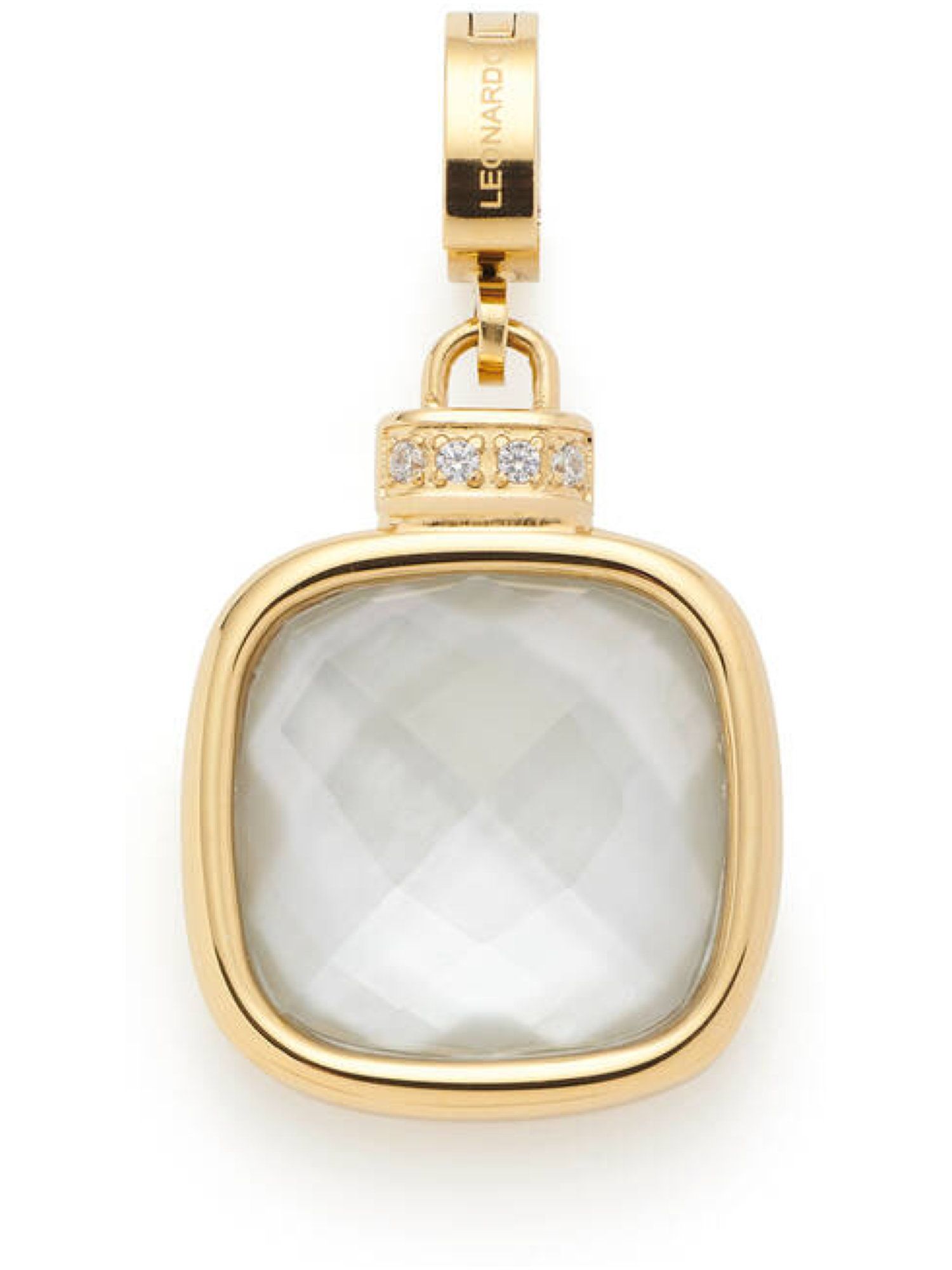 Der quadratische Anhänger mit sanft abgerundeten Ecken begeistert durch seine edle Glasstein-Dublette im Kissenschliff, die dank einer feinen Schicht aus natürlichem Perlmutt wunderschön schimmert. Eine schmale, goldfarbene Fassung fasst den Stein stilvoll ein, während die pavé-besetzte Aufhängung mit Clip-Verschluss für einen Hauch von Glamour sorgt. Der Clip ermöglicht ein einfaches Anbringen an verschiedenen Ketten – etwa an der passenden VIRGINIA-Kette oder anderen Schmuckstücken von JEWELS BY LEONARDO