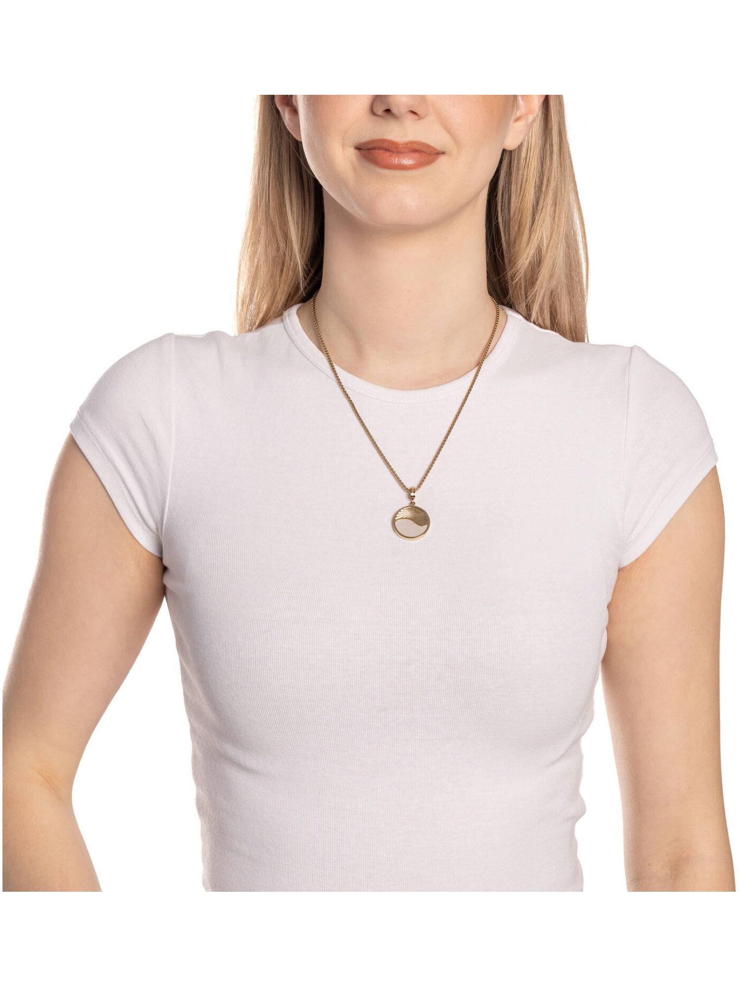 Der runde Anhänger aus poliertem, goldfarbenem Edelstahl zeigt in seiner oberen Hälfte ein fein gearbeitetes Sonnenmotiv, das von einer zarten Wellenlinie umrahmt wird. In der unteren Hälfte schimmert eine flache Perlmutt-Einlage, die für sanfte Lichtreflexe sorgt und dem Design eine harmonische Tiefe verleiht. Dank des integrierten Clips in Größe M lässt sich SOLARIS flexibel an passenden Basis-Ketten oder -Armbändern befestigen und individuell kombinieren.