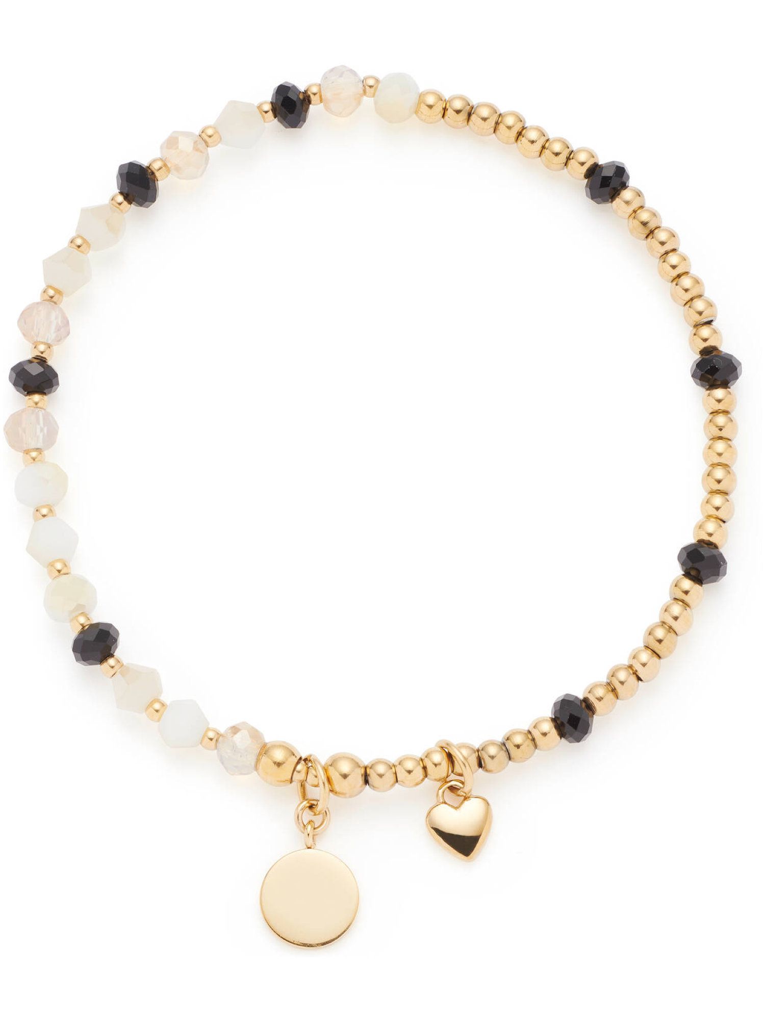 Das Armband besteht aus polierten Goldkugeln und Glasschliffperlen in Weiß, Nude und Schwarz, die sich zu einem stilvollen Mix aus hellen und dunklen Nuancen verbinden. Der edle Farbverlauf sorgt für Tiefe und Raffinesse, während das elastische Zugband ein angenehmes Tragegefühl bietet. Ein rundes, gravierbares Plättchen und ein kleines Herz mit LEONARDO Logo verleihen dem Design einen liebevollen Akzent.