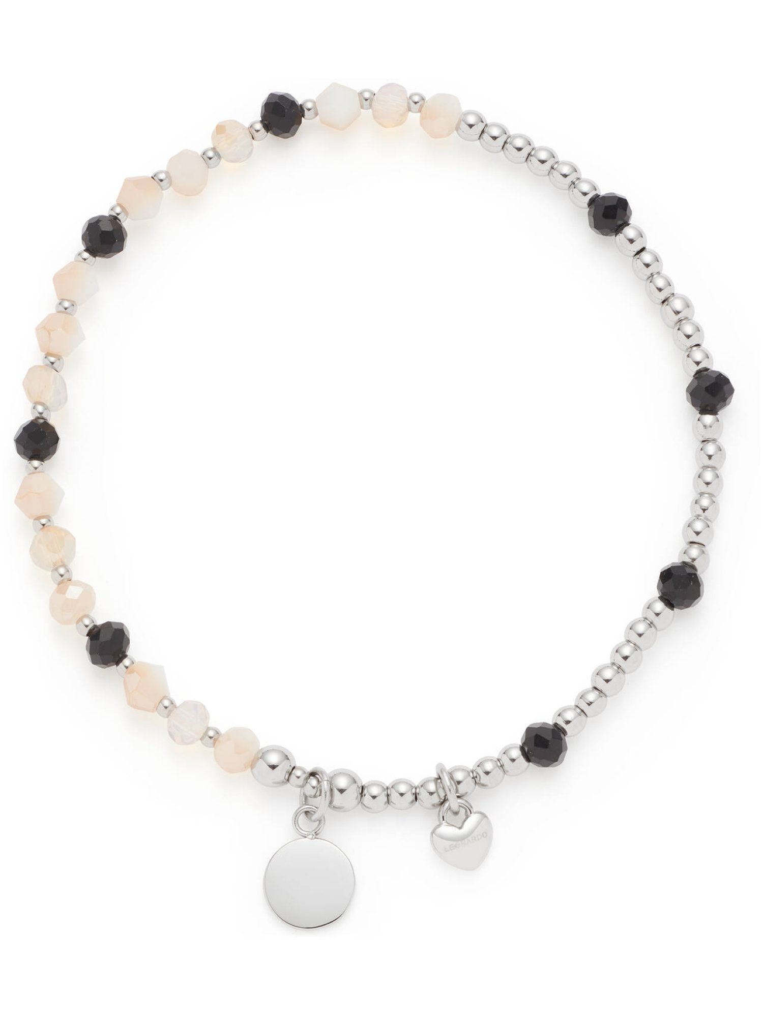 Das Armband kombiniert Glasschliffperlen in Weiß, Nude und Schwarz mit polierten Stahlkugeln, die dem Design eine moderne Struktur verleihen. Durch die abwechslungsreiche Farbkomposition entsteht ein edler, grafischer Look, der sich vielseitig kombinieren lässt. Ein kleines Herz mit LEONARDO Logo und ein rundes Gravurplättchen ergänzen das Armband um feine, persönliche Details. Dank des elastischen Zugbands lässt sich das Schmuckstück schnell und bequem anlegen. D