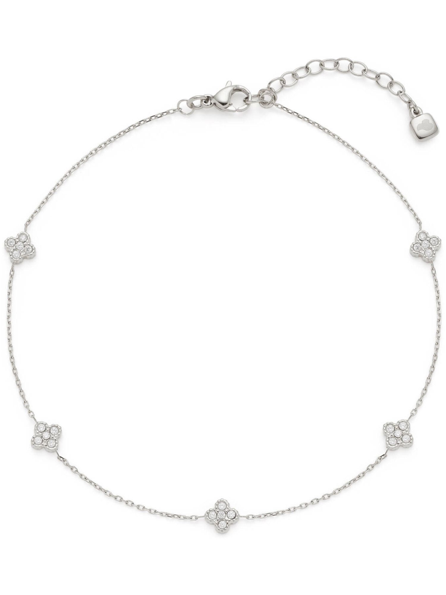 Die feine Ankerkette aus poliertem Edelstahl wird durch zarte, blütenförmige Elemente mit funkelnden Zirkonia-Steinen veredelt, die bei jeder Bewegung Lichtreflexe erzeugen. Durch den Karabinerverschluss lässt sich die Fußkette leicht anlegen und sitzt angenehm am Fuß.