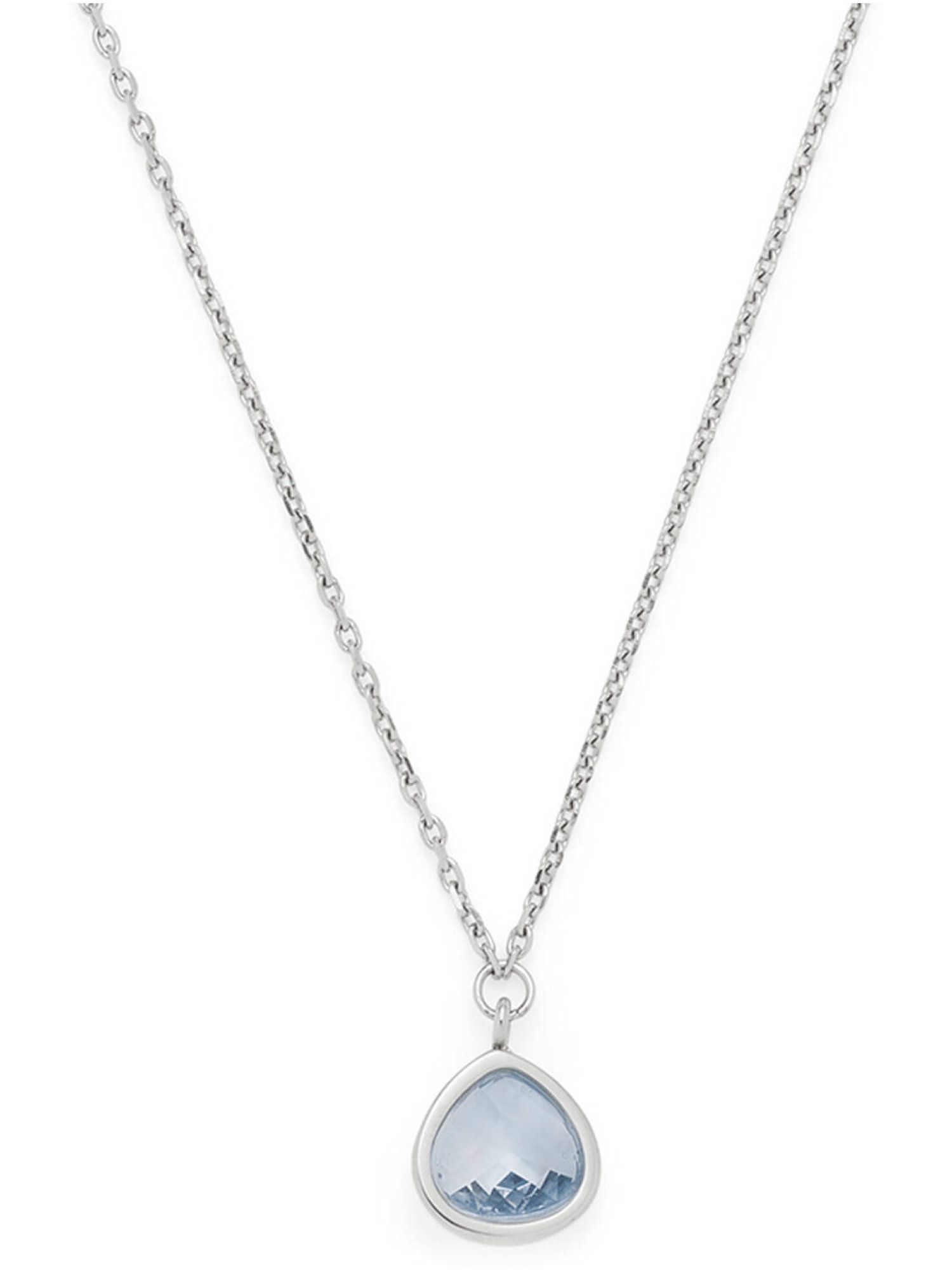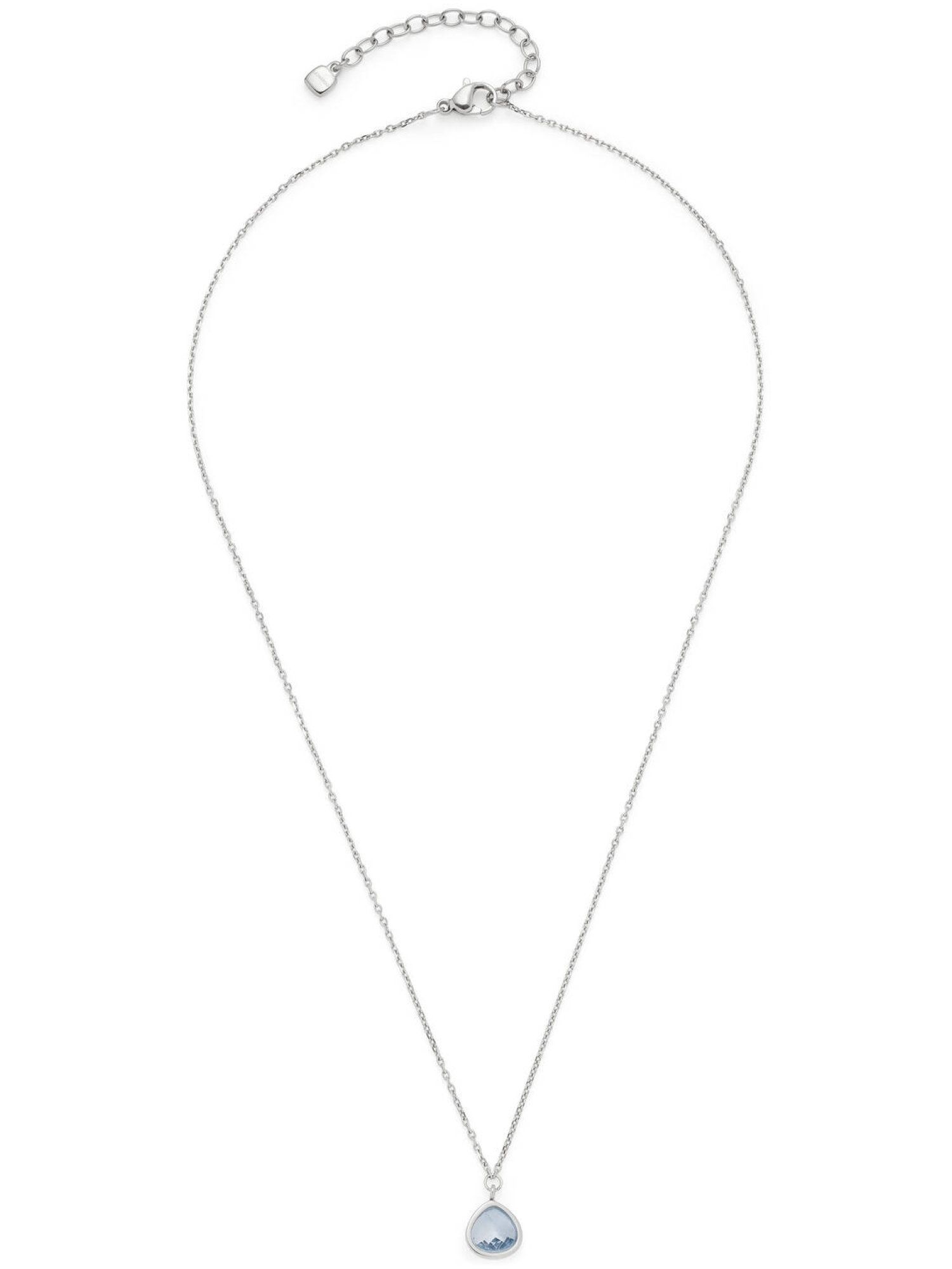 Die kurze, feine Ankerkette aus poliertem Edelstahl trägt einen blassblauen, facettierten Glasstein in Form eines rundlichen Dreiecks. Durch seine transparente, lichtreflektierende Oberfläche entsteht ein sanfter Glanz, der jeden Look aufwertet. Der schmale Rahmen unterstreicht das minimalistische Design und bringt den Stein dezent zur Geltung. Dank Karabinerverschluss mit Verlängerungskette lässt sich die Länge flexibel anpassen.