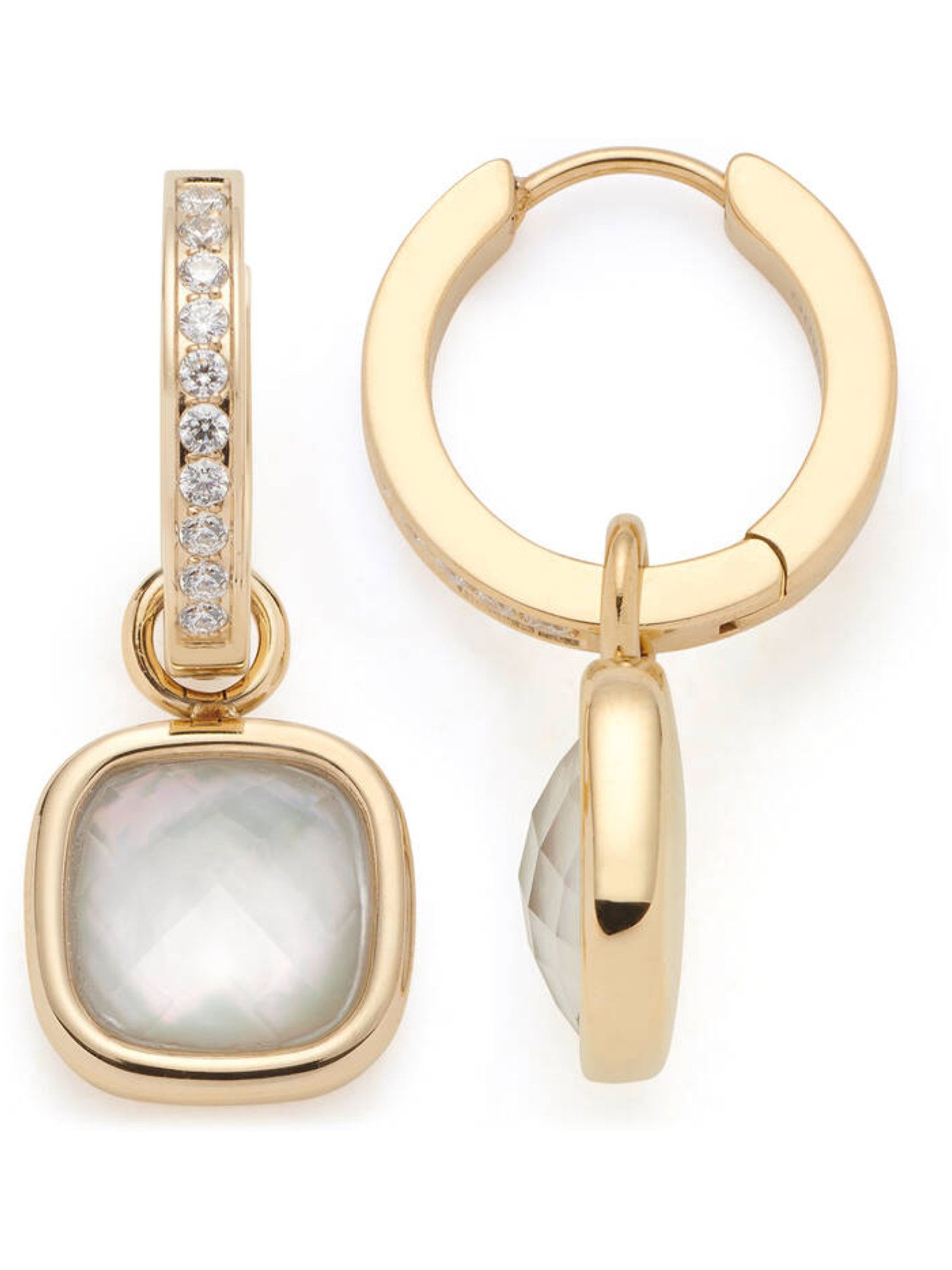 Die pavé-besetzten, goldfarbenen Creolen strahlen durch ihre feinen, funkelnden Steinchen und lassen sich dank abnehmbarer Einhänger vielseitig tragen. Die Einhänger zeigen quadratische, weiße Glasstein-Dubletten in einer schmalen, goldfarbenen Fassung.